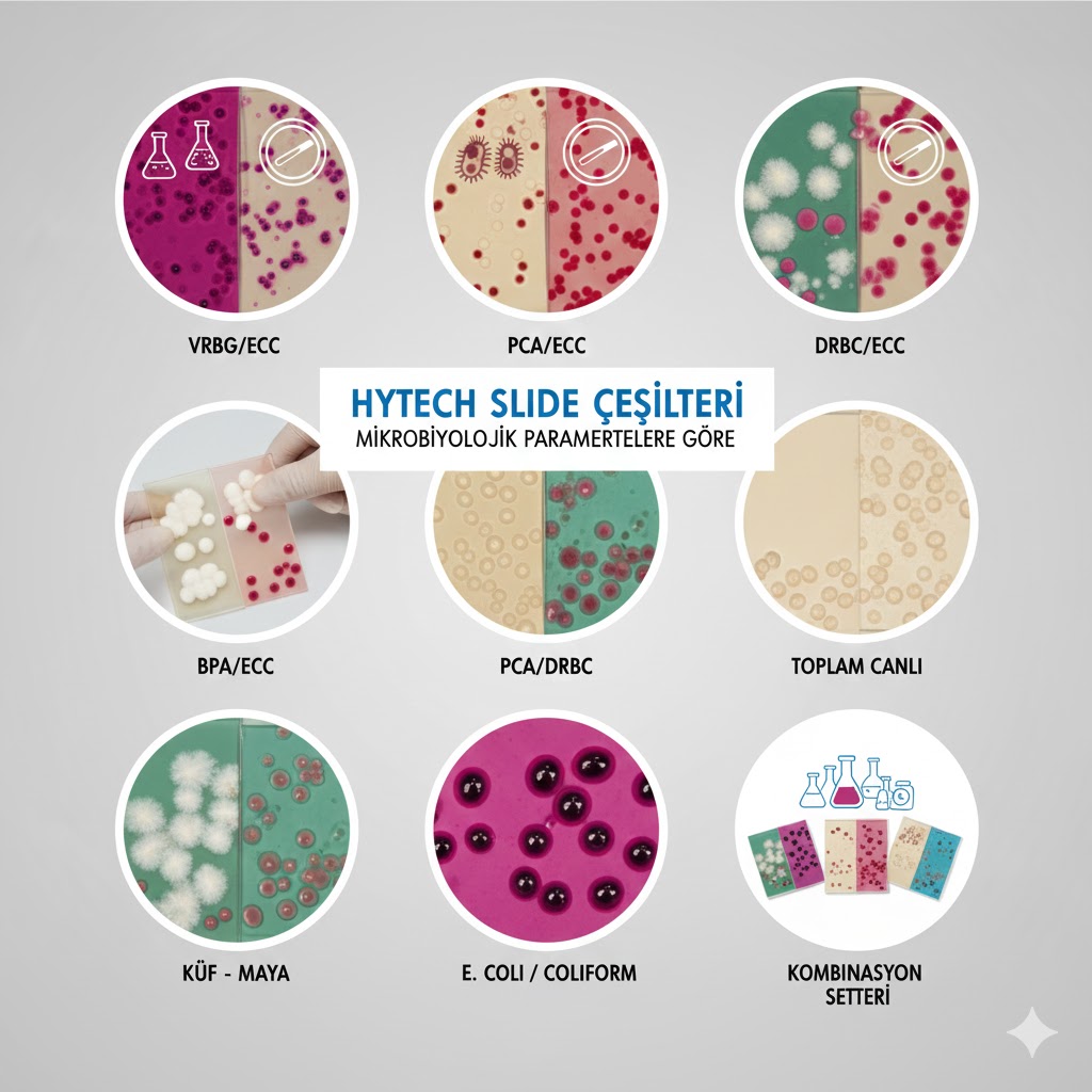 Aşağıdaki Hytech Slide çeşitleri mikrobiyolojik parametrelere göre seçilir: