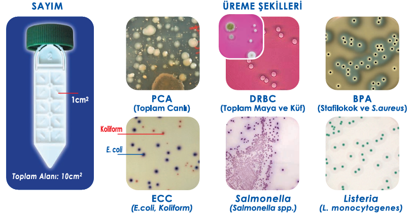 • DRBC/ECC: Küf ve maya kontaminasyonu ile birlikte E.coli/Coliform tespiti için kullanılır. Üretim hatları, yüzeyler ve gıda sektöründe yaygındır.