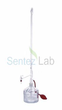 BORUCAM cam musluklu şeffaf otomatik büret. Titrasyon işlemƖerinde ve belli hacimde sıvı alınmasında kullanılan altı musluklu, genellikle 50 mƖ hacimƖi, üzeri çizgilerle derecelendirilmiş boru şeklindeki cam malzemedir. Genelde pipet ile karıştırılır. Özel bir tutuş stili vardır. Analitik kimya laboratuvarında titrasyon işlemƖerinin vazgeçilmez aracıdır. Musluk sol tarafta iken sağ elin iki parmağı ile musluk tutularak işlem gerçekleştirilir. Bu şekilde kullanılan büret ile daha verimƖi bir deneysel çalışma gerçekleştirilir. Büretlerin hem otomatik hem de manuel olanları vardır. Genellikle 25-50-100 mƖ hacmindedir. Titrasyon işlemƖerinde sıvı hacimƖerini ölçmede kullanılır. |