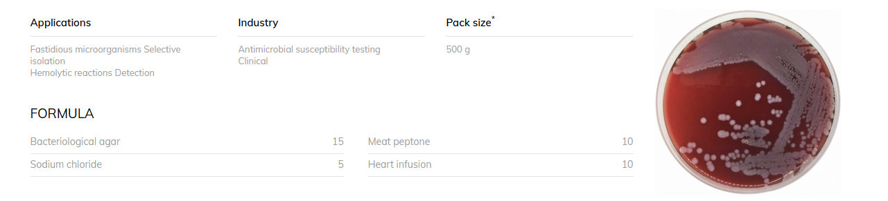Condalab 1108 Blood Agar Base 500g hemolitik aktivitenin tespiti ve zor yetişen (fastidious) mikroorganizmaların izolasyonu, yetiştirilmesi ve sayımı için kullanılan seçici bir besiyerdir. İçeriğindeki et peptonu, kalp infüzyonu ve uygun mineral tuzlar, bakterilerin optimum büyümesi için gerekli besin ortamını sağlar. Bu besiyeri, özellikle hemolitik reaksiyonların gözlenmesi, klinik izolasyonlar ve antimikrobiyal duyarlılık testleri için idealdir.