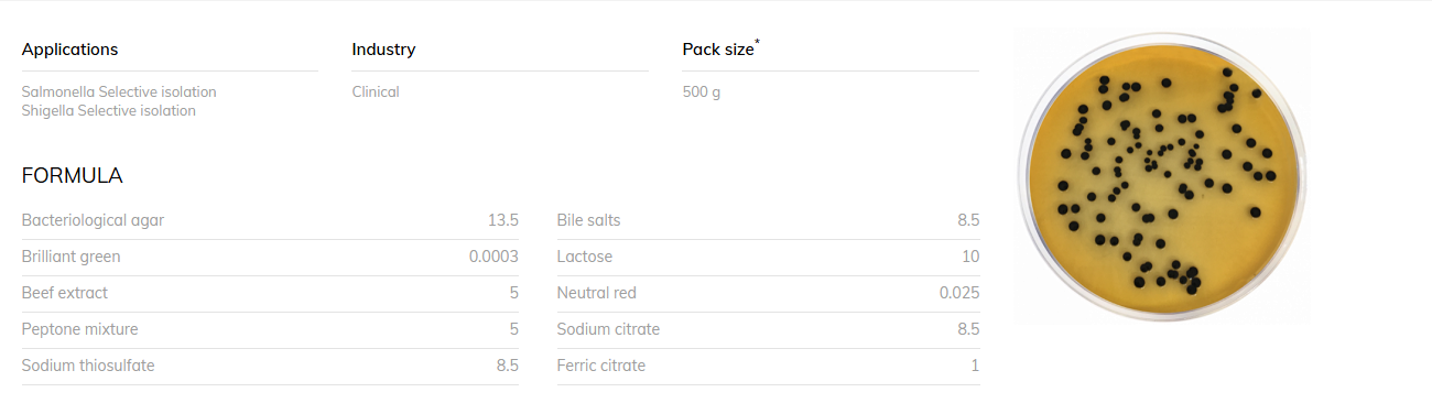 Condalab Salmonella Shigella Agar (SS Agar) 500g, enterik patojenlerin seçici izolasyonu için geliştirilmiş bir katı besiyeridir. Özellikle Salmonella ve Shigella türlerinin izolasyonu ve ayrımı için klinik, gıda ve su analizlerinde yaygın olarak kullanılır.