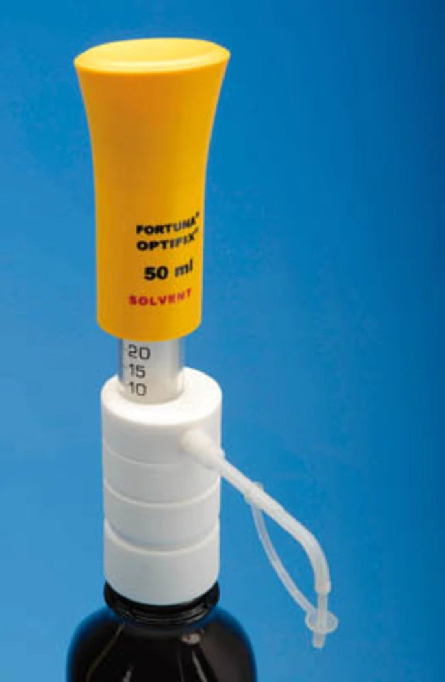 Dispenser Fortuna Optifix SOLVENT: Ultra saf solventler güvenle dozajlanabilir.Cam Pistonludur. Metal aksam bulunmaz.