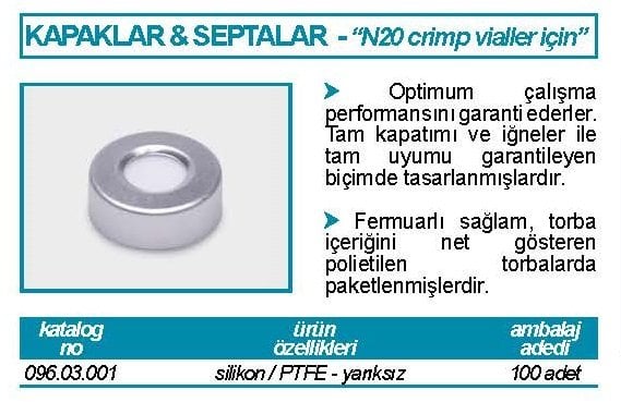 ISOLAB 096.03.001 kapak + septa - silikon / PTFE - yarıksız - N20 vial için - 100 adet